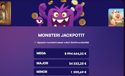 Erottautuvana erikoisuutena huomasin, että Slottimonsteri jakaa omia jättipottejaan - jopa miljoonia! Homma toimii siten, että osallistumalla jackpot-jahtiin, jokaiseen panokseesi lisätään automaattisesti 0,10€ ekstraa, joka ohjautuu jättipottikassaan. Näin voit jahdata miljoonavoittoa kaikissa peleissä. Mega Jackpot alkaa aina 5 000 000 euron takuupotista.